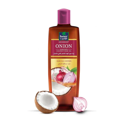 Parachute Advansed Onion Enriched Coconut Hair Oil, un produit capillaire conçu pour allier les bienfaits traditionnels de la noix de coco aux propriétés régénératrices de l'oignon.